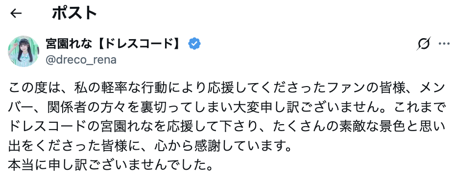 今回の件を受け、宮園れなは自身の公式Xで謝罪文を投稿しています。(全文は上記画像を参照)