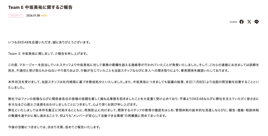 SKE48の中坂美祐(なかさか・みゆ)が、2026年1月8日から活動自粛することを運営事務所が発表しました。